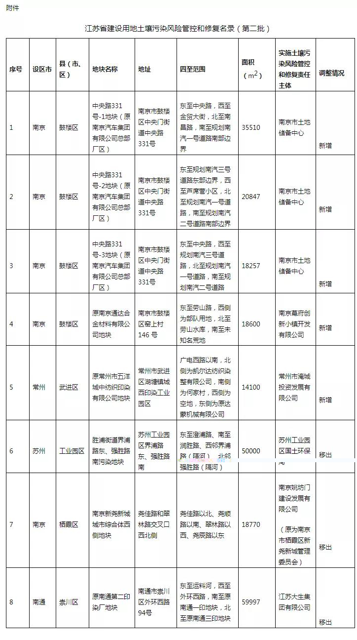 根據(jù)建設(shè)用地土壤污染風(fēng)險評估情況,將南京市鼓樓區(qū)中央路331號-1地塊(原南京汽車集團(tuán)有限公司總部廠區(qū))等5個地塊新增列入名錄管理。